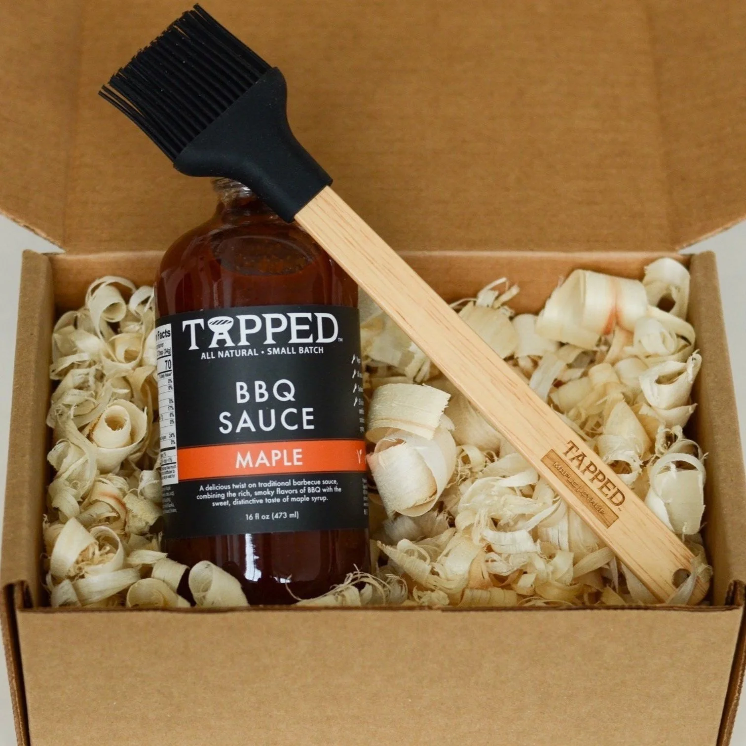 A delicious and practical gift idea for your favorite grill master: a 16 fl oz bottle of Tapped Maple BBQ Sauce paired with a custom wood and silicone basting brush. This thoughtfully curated set provides the essential for delicious grilling mastery. $18
